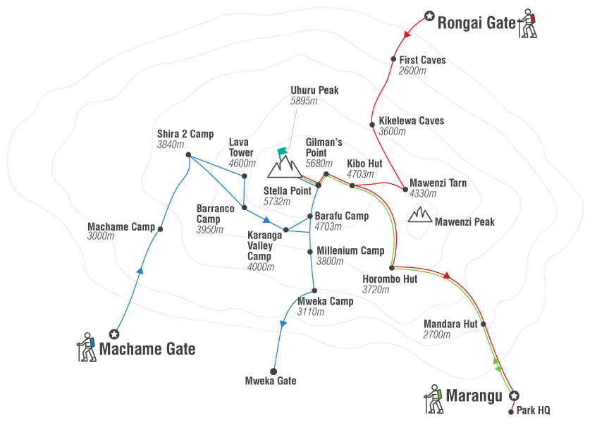 Having helped over 10,000 people Climb Kilimanjaro we know that for every one of them, the best route was the route which gave them the best chance to stand on the top of this awesome mountain. So there are seven Kilimanjaro Routes from which we will recommend 5 routes namely: the Machame Route, Lemosho route, Rongai route, Marangu Route and the Northern Circuit Route.