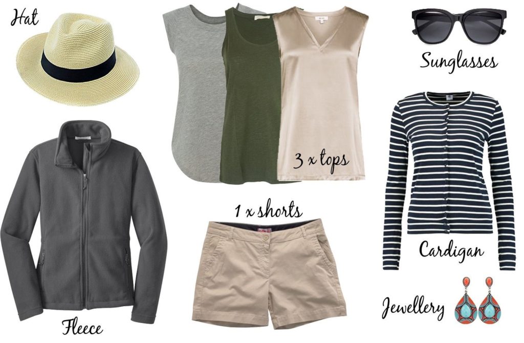 | Sun hat (optional) | Two short-sleeve shirts) |